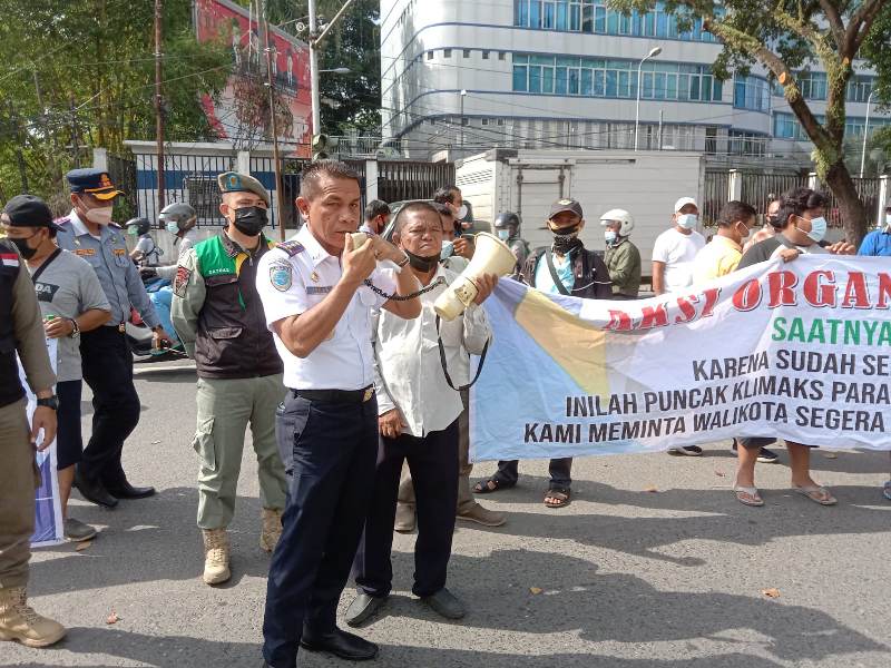 Ratusan pemilik dan pengemudi KPUM dan MRX trayek Medan-Amplas melakukan unjuk rasa (Unras) di depan kantor Walikota Medan, Senin, (21/2/2022). (Foto-HL)