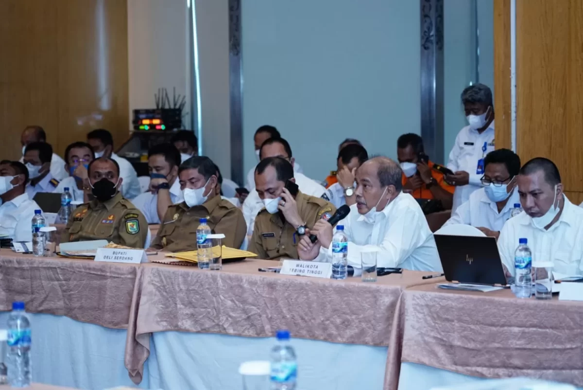 Walikota Tebingtinggi Ir. H. Umar Zunaidi Hasibuan (kedua dari kanan) saat menyampaikan perihal penanganan banjir yang kerab terjadi di Kota Tebingtinggi pada Reses Raker Komisi V DPR RI di Sumut, Senin (21/2/2022) di Hotel Cambridge Jl. S. Parman Medan.(SB/komf)