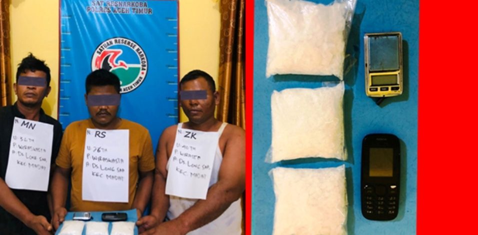 Kemudian pada hari Kamis, 07/04/22 pada pukul 19.30 WIB dari sebuah rumah di Desa Long Sa, Kecamatan Madat, Tim Opsnal Satres Narkoba Polres Aceh Timur mengamankan RS (26), MN (36), dan ZK (40) ketiganya warga setempat, karena berdasarkan informasi mereka akan melakukan transaksi narkotika jenis shabu, kemudian dilakukan penggeledahan terhadap badan ketiganya dan melakukan penyisiran di seputaran rumah milik pelaku MN tersebut.