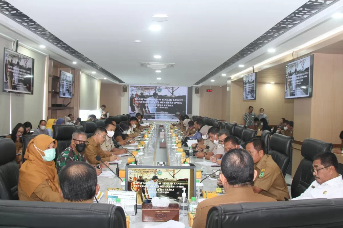 Rapat koordinasi (Rakor) penanganan penyakt mulut dan kuku (PMK) bersama seluruh unsur Forkopimda Sumut dan dinas yang menangani peternakan di kabupaten/kota, Selasa (14/6). (f-ist)