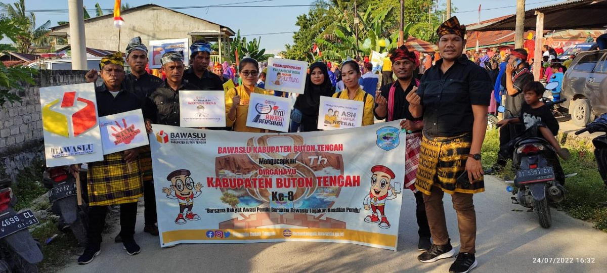 sentralberita | Sultra ~ Semarak hari jadi Kabupaten Buton Tengah yang ke delapan tahun, Badan Pengawas Pemilu (Bawaslu) Kabupaten Buton Tengah ikut meramaikan pawai karnaval budaya di Kecamatan Gu, Minggu (24/07/2022)