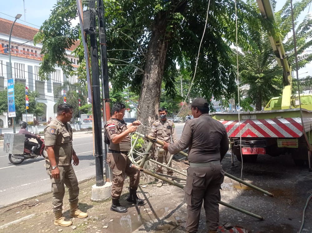 sentralberita|Medan ~ Tim gabungan Satpol PP Kota Medan terus melakukan razia penertiban papan reklame yang menyalahi aturan, Selasa (26/7). Penertiban ini dilakukan di sejumlah ruas jalan di Kota Medan. Salah satunya di jalan HM Yamin SH, Kelurahan Perintis, Kecamatan Medan Timur tepatnya didepan kantor Dinas Pariwisata Kota Medan.