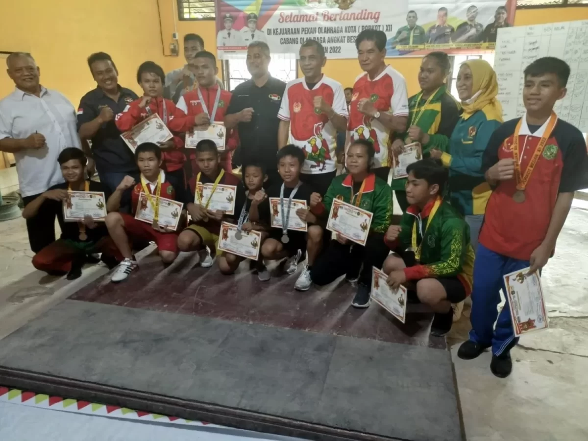 Kontingen Medan Tembung keluar sebagai juara umum cabor angkat besi Pekan Olahraga Kota (Potkot) Medan XII 2022 yang digelar di Gedung PABSI Sumut Jalan Masjid Medan-Helvetia, Selasa (9/8). (F-ist)