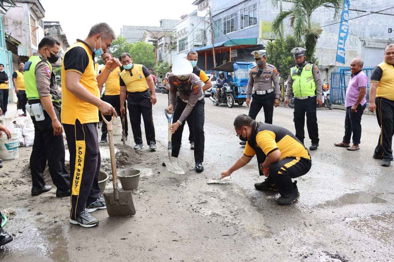 Personil Polres Tanjung Balai Kerja Bakti, Menyemen jalan Rusak berlobang di Kota Tanjung Balai.(f-ist)