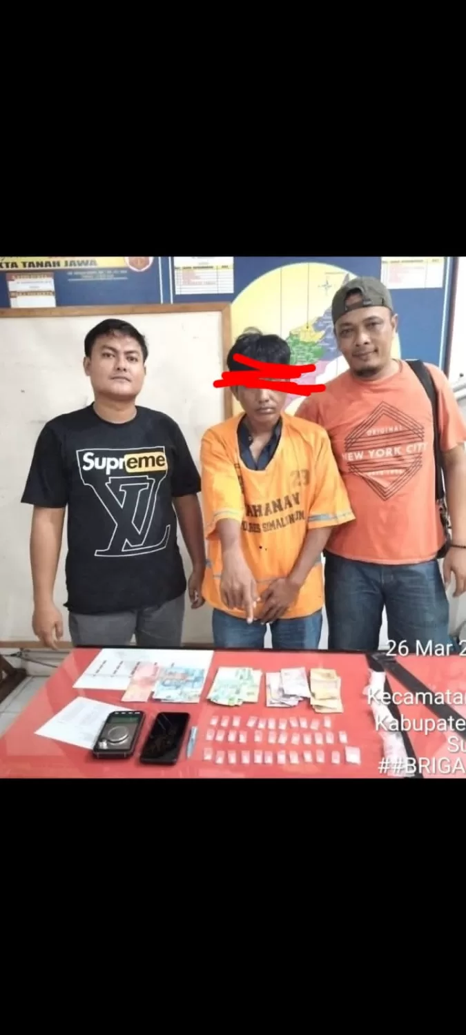 Sampai di TKP unit Reskrim Polsek Tanah Jawa melihat seseorang yang sesuai dengan ciri-ciri yang di informasikan dan langsung meringkus pelaku AM, dari hasil introgasi awal pelaku AM mengakui bahwa dirinya sebagai Bandar Narkotika jenis Sabu. Dari hasil penggeledahan kepada AM di dapati :