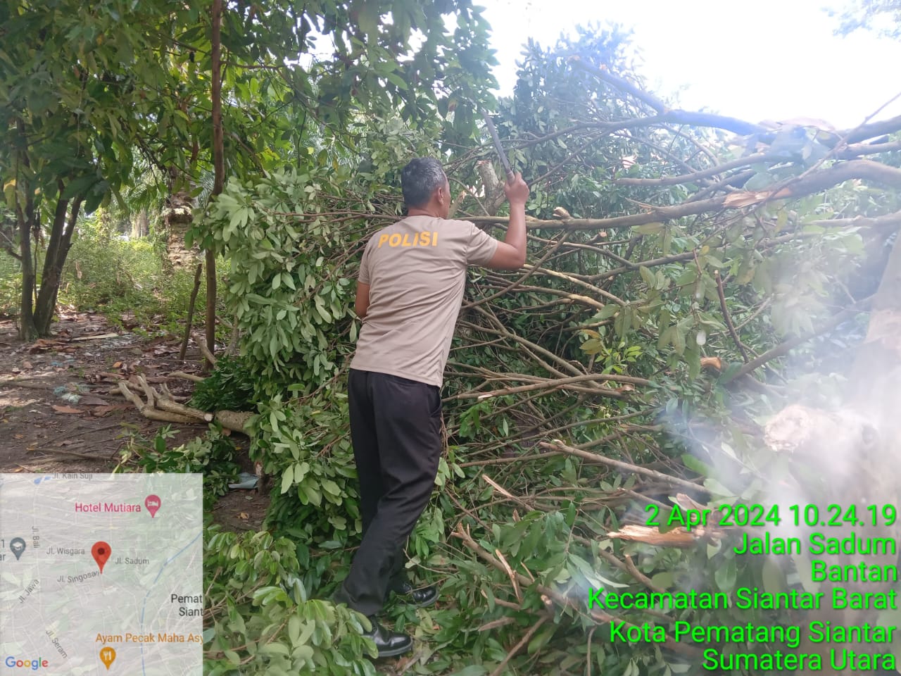 AIPDA Rayendra P. Damanik SH Bhabinkamtibmas Kelurahan Bantan Polsek Siantar Barat, Polres Pematang Siantar gerak cepat respon laporan masyarakat dengan ikut langsung membantu membersihkan rumah nenek berumur 124 tahun bernama Saji yang tertimpa pohon tumbang.
