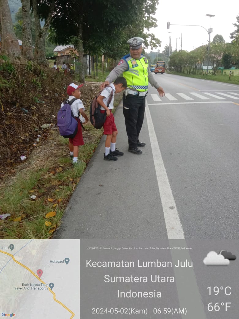 sentralberita | Lumbanjulu ~ Untuk menjaga Kamtibmas, Personil Polsek Lumbanjulu Polres Toba AIPDA H Siregar melaksanakan protap strong point dan gatur Lalu Lintas di SMP dan SD Negeri Lumban julu Kecamatan Lumbanjulu Kabupaten Toba Provinsi Sumatera Utara, Kamis (02/05/2024) sekira pukul 07.00 Wib Pagi Hari