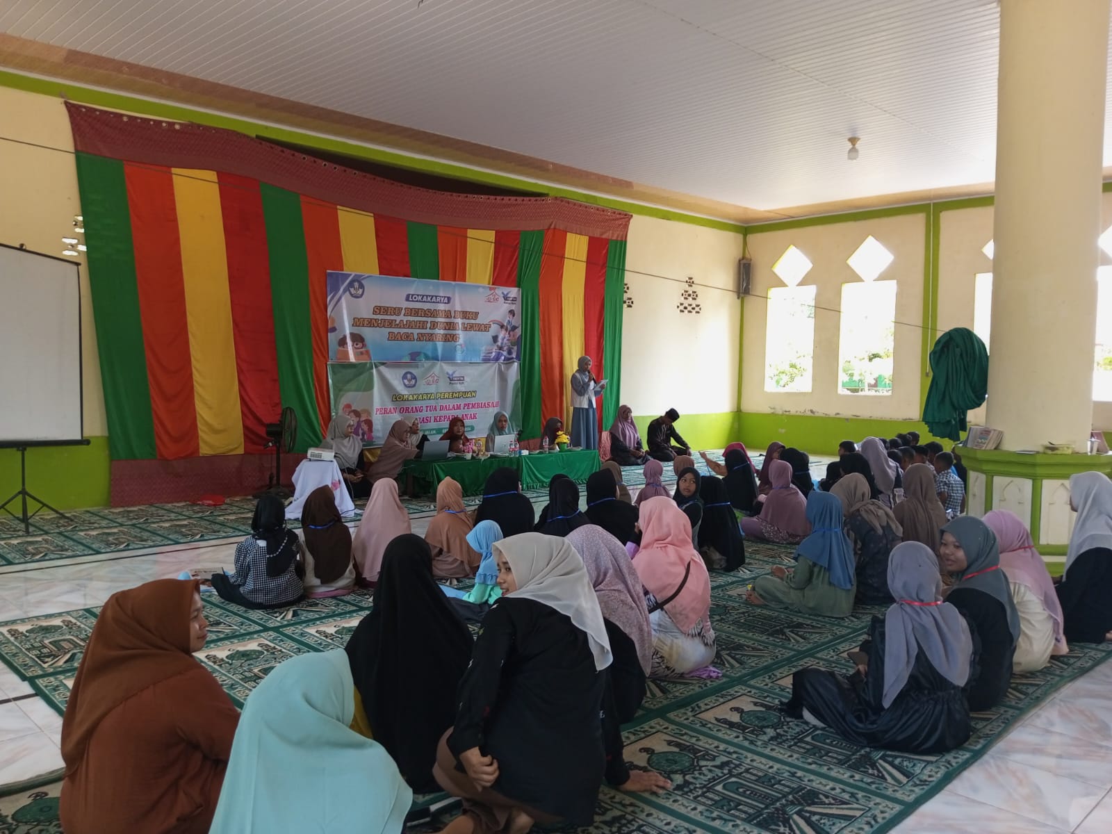 Selain peran orang tua, juga ada Lokakarya Seru bersama buku menjelajahi dunia lewat baca nyaring dengan 45 peserta, anak – anak sekitar rumah baca Saleum Cahaya, di musalla.