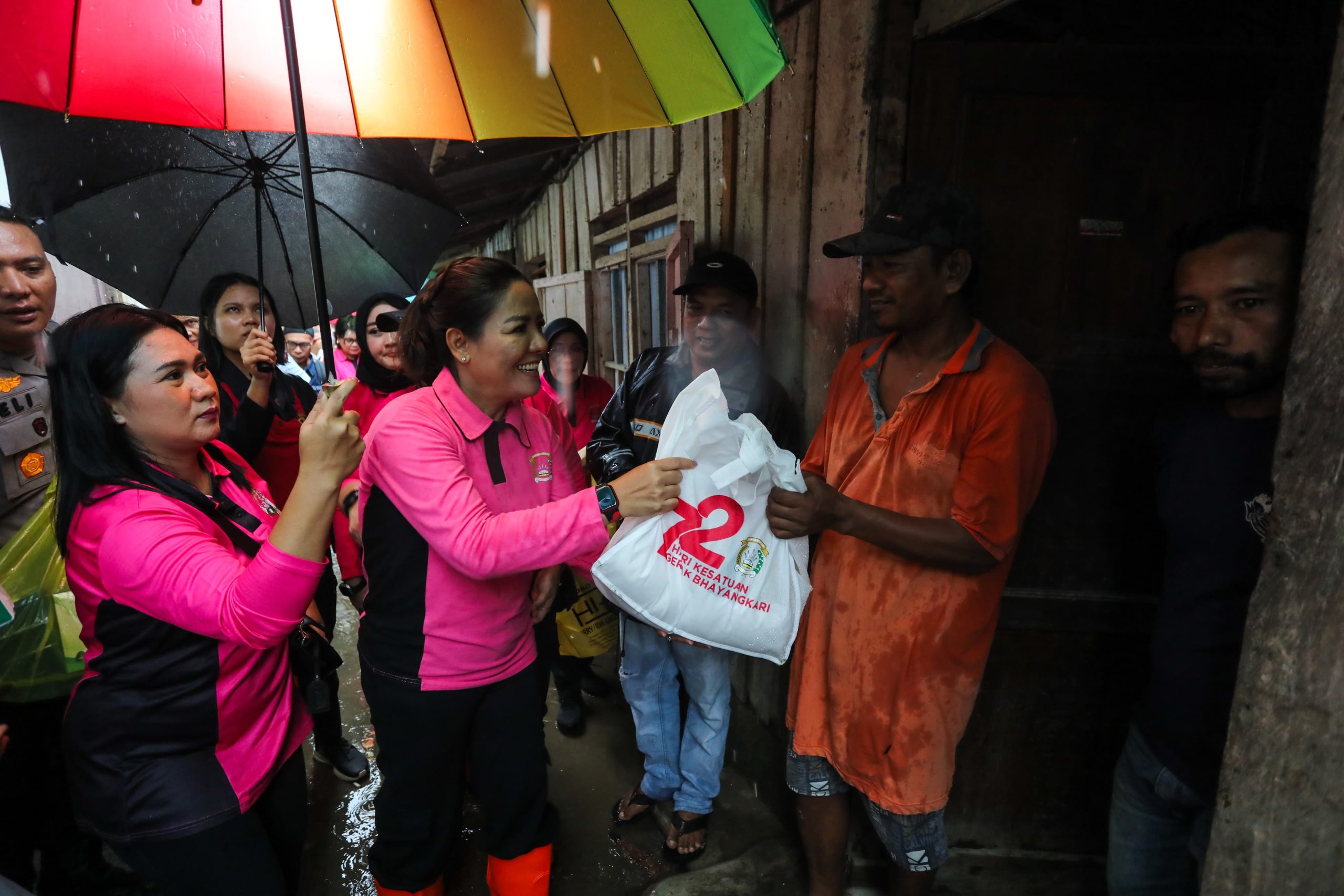 Sementara itu, di posko darurat di Kelurahan Persiakan, Ketua Bhayangkari Polda Sumut Ny Whisnu Hermawan Febrianto dan tim Bhayangkari membagikan sembako kepada warga yang terdampak banjir.