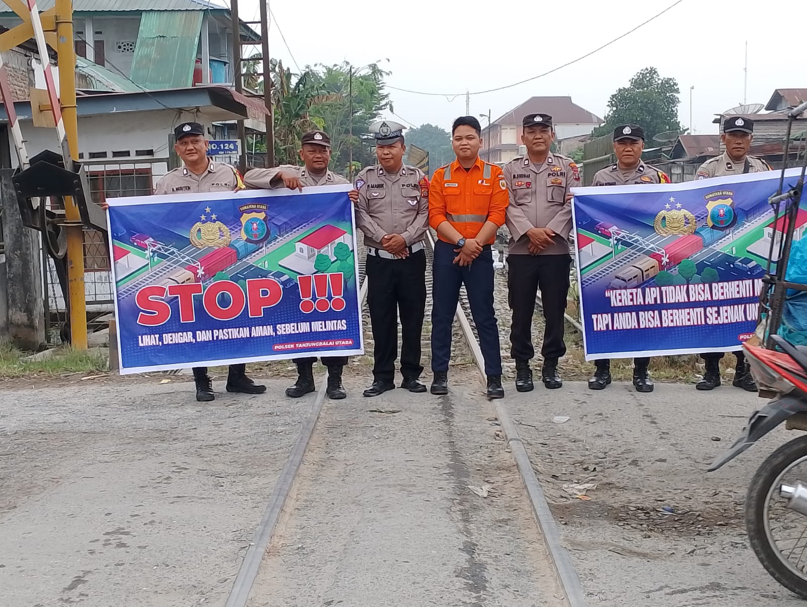 sentralberita | Tanjungbalai ~ Dalam rangka meningkatkan kesadaran dan kepedulian masyarakat terhadap keselamatan saat melintas di perlintasan kereta api, Bhabinkamtibmas bersama Sat Lantas, Polsek Tanjung Utara Polres Tanjungbalai melaksanakan himbauan kepada para pengguna jalan.