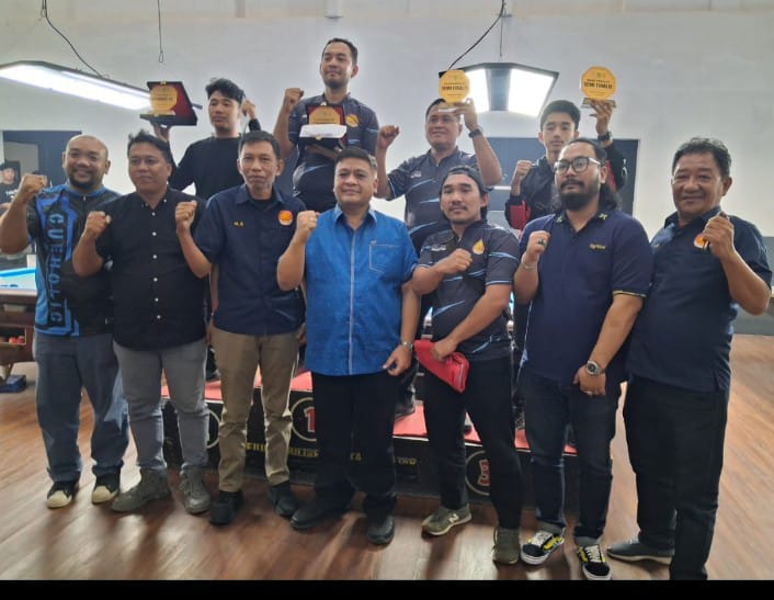 Ketua POBSI Sumut Salomo TR Pardede, Ketua POBSI Medan Halomoan Samosir dan lainnya bersama juara Turnamen Biliar Piala Wali Kota Medan 2025.