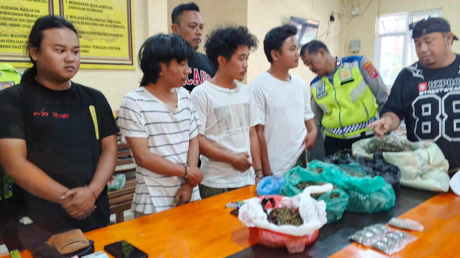 “Awalnya, petugas mengamankan tersangka RAS bersama satu paket ganja. Setelah dilakukan pengembangan, petugas berhasil menangkap empat tersangka lainnya dengan total barang bukti puluhan paket ganja,” jelas Kapolsek.