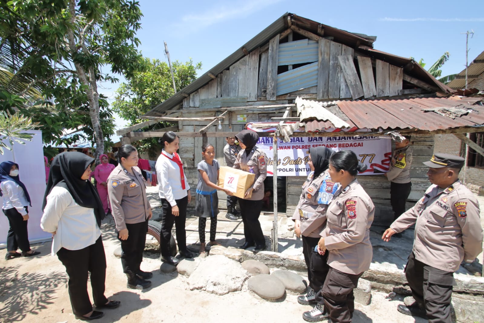 Sebanyak enam keluarga penerima manfaat mendapat bantuan paket sembako yang disalurkan langsung oleh jajaran Polwan dan Bhayangkari. Bantuan ini diharapkan dapat meringankan beban masyarakat, khususnya warga yang rumahnya rusak akibat musibah angin puting beliung yang melanda beberapa hari lalu.