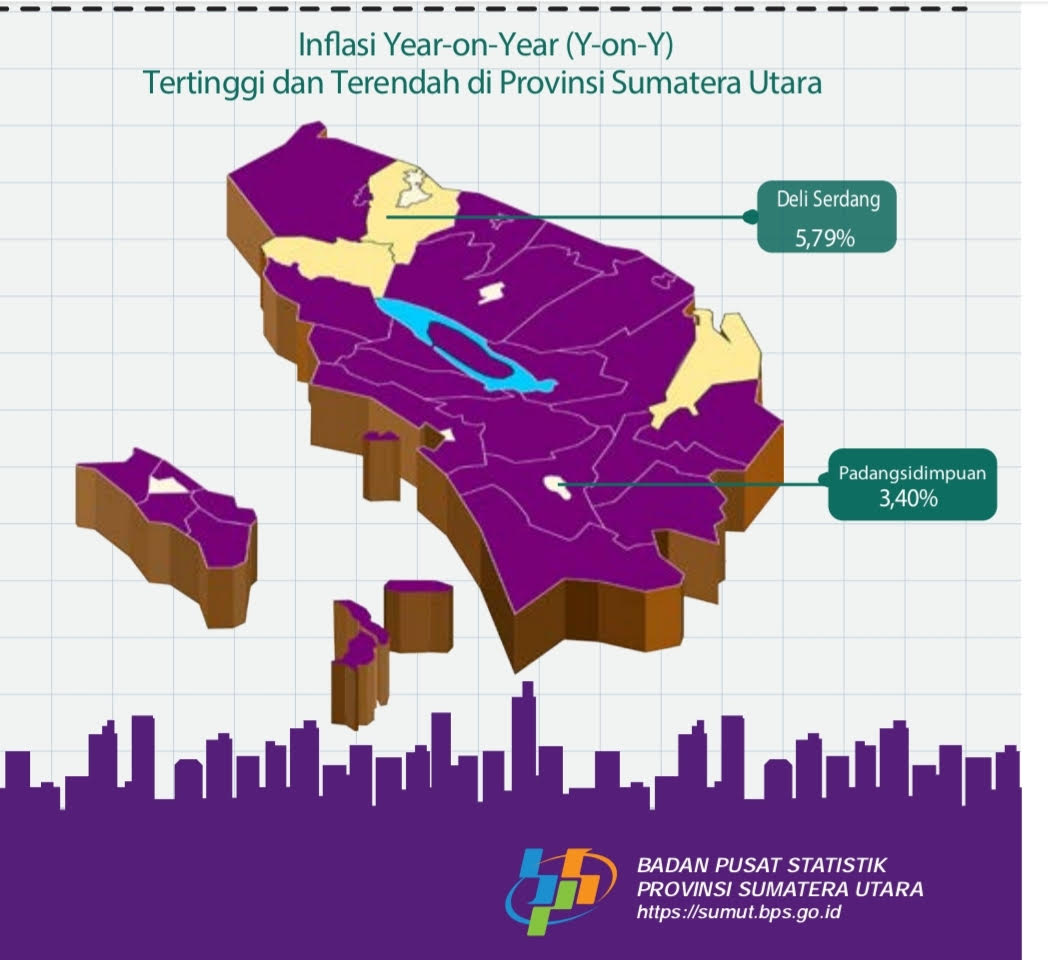 sentralberita | Medan ~ Inflasi y-on-y tertinggi terjadi di Kabupaten Deliserdang sebesar 5,79 persen dengan IHK sebesar 111,25, dan terendah terjadi di Kota Padangsidimpuan sebesar 3,40
