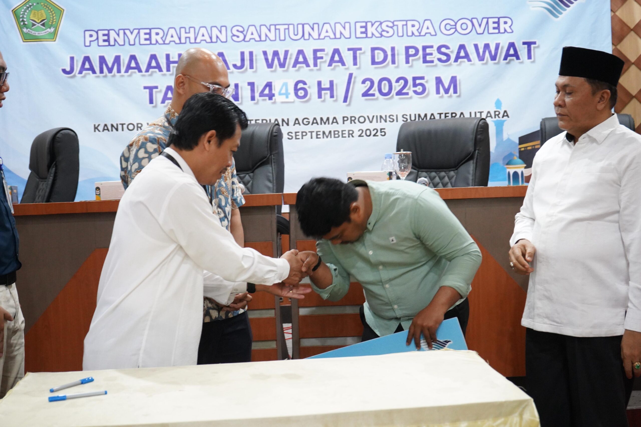 sentralberita | Medan ~ Kementerian Agama dan Garuda Indonesia menunjukkan komitmen perlindungan kepada jemaah haji melalui penyerahan santunan ekstra cover kepada ahli waris Hj. Nurmalis Binti Ujang, jemaah haji asal Kab. Deli Serdang yang tergabung dalam kloter 4 Debarkasi Medan tahun 1446H/2025M yang wafat saat berada dalam penerbangan pulang menuju tanah air.