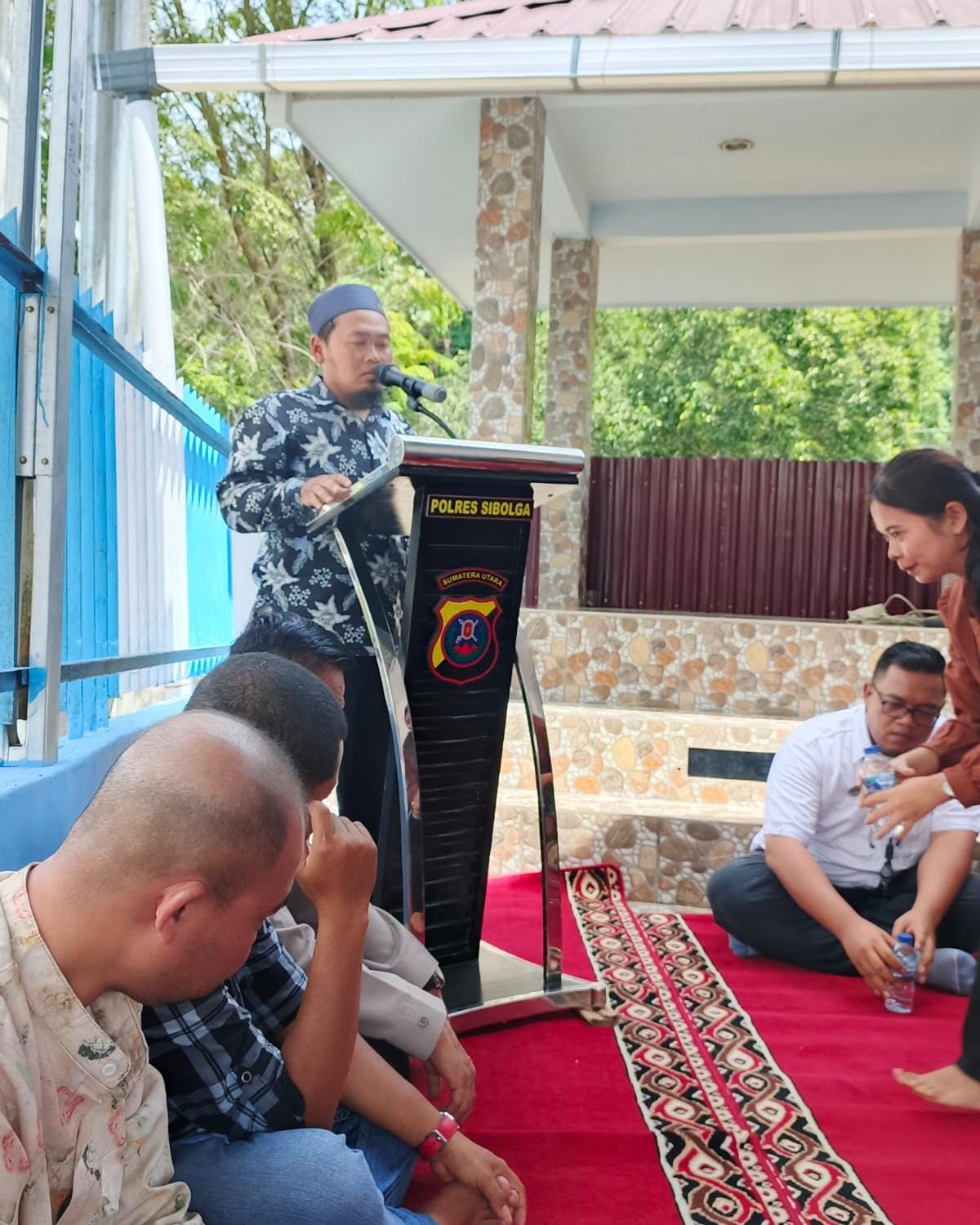 Kegiatan diawali dengan pembukaan acara, dilanjutkan sambutan dari Kapolres Sibolga, ceramah keagamaan oleh *Ustadz Qlby*, doa bersama, serta makan siang dan ramah tamah yang menambah kekhidmatan dan keakraban seluruh peserta.