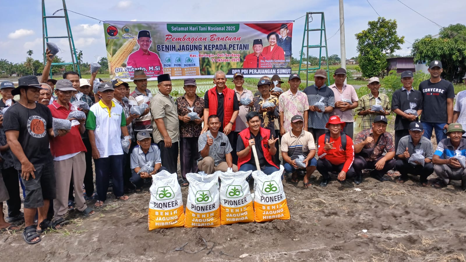 sentralberita|Deli Serdang~ Wakil Ketua DPRD Sumatera Utara (Sumut) Dr Sutarto MSi memberi bantuan bibit Jagung kepada petani warga Desa Karang Anyar Kecamatan Beringin, Kabupaten Deli Serdang, Sabtu (11/10/25)