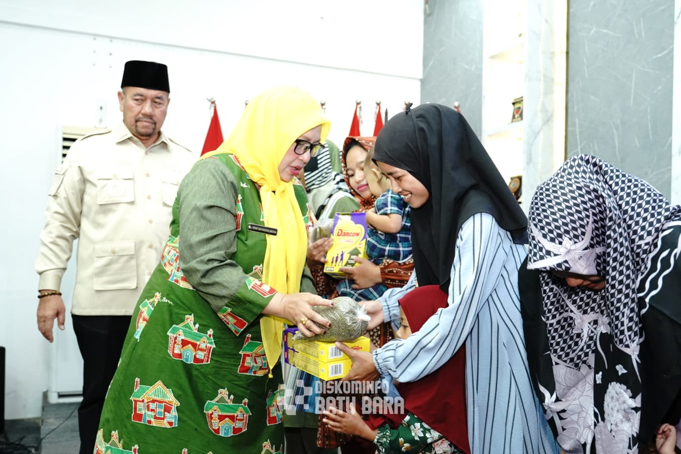 sentralberita I Batubara ~ Bupati Batu Bara, Bapak H. Baharuddin Siagian, S.H., M.Si., bersama Ketua Tim Penggerak Pemberdayaan dan Kesejahteraan Keluarga (TP-PKK) Kabupaten Batu Bara, Ny. Henny Heridawaty Baharuddin menghadiri kegiatan pemberian makanan tambahan berupa susu dan kacang hijau secara gratis kepada anak-anak stunting di Kecamatan Sei Suka. Kegiatan tersebut berlangsung di Aula Rumah Dinas Bupati Batu Bara, Selasa (21/10/2025).
