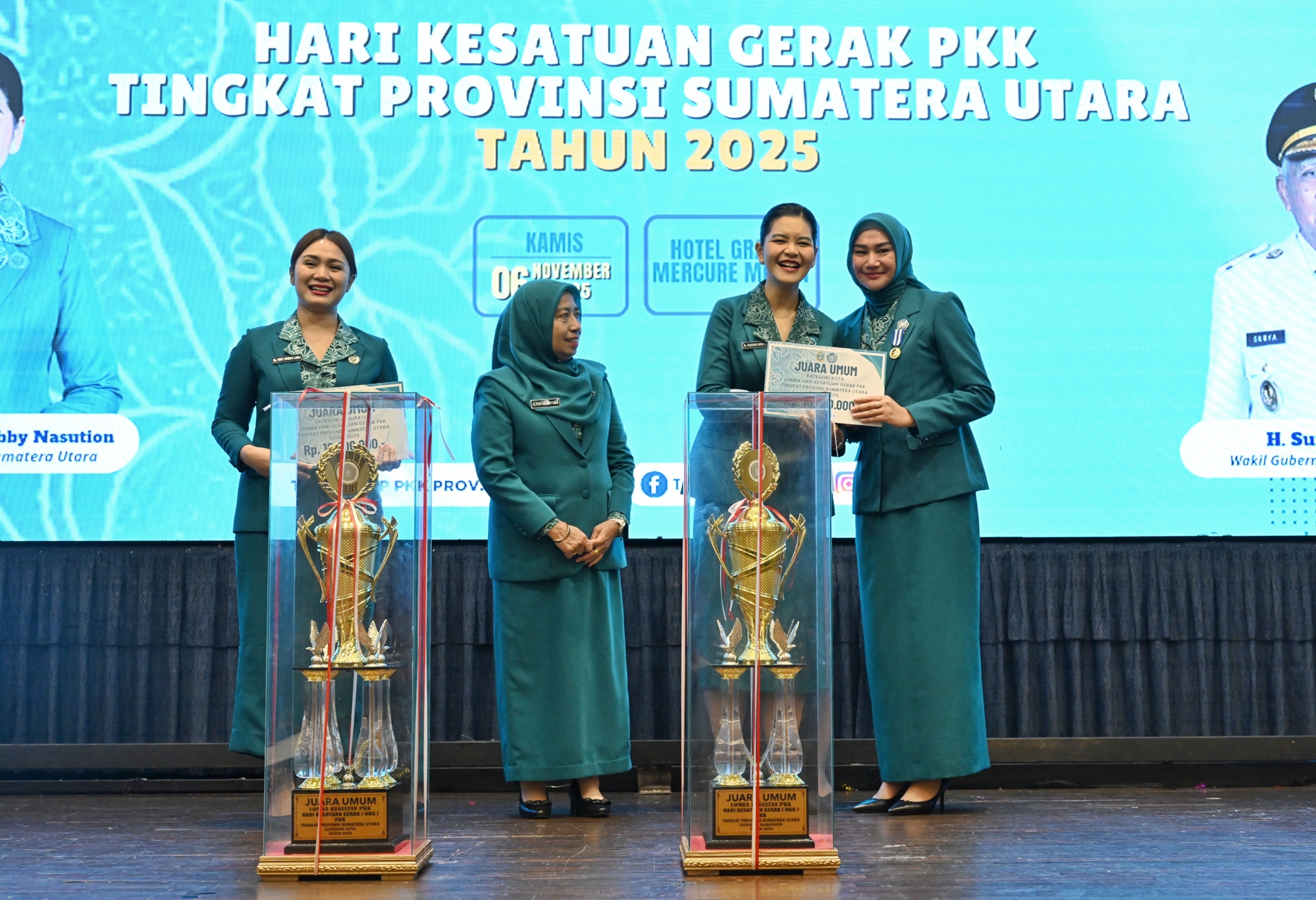“Dari lima kategori yang dilombakan, saya titip kepada pengurus PKK Provinsi hingga Kabupaten/Kota se-Sumut agar terus meningkatkan pola asuh anak dan remaja, serta pemberdayaan ekonomi keluarga,” kata Bobby Nasution pada penutupan dan penyerahan hadiah Hari Kesatuan Gerak (HKG) PKK Tingkat Provinsi Sumut Tahun 2025, di Ballroom Hotel Grand Mercure, Jalan Sutomo No. 1 Medan, Kamis (6/11/2025).