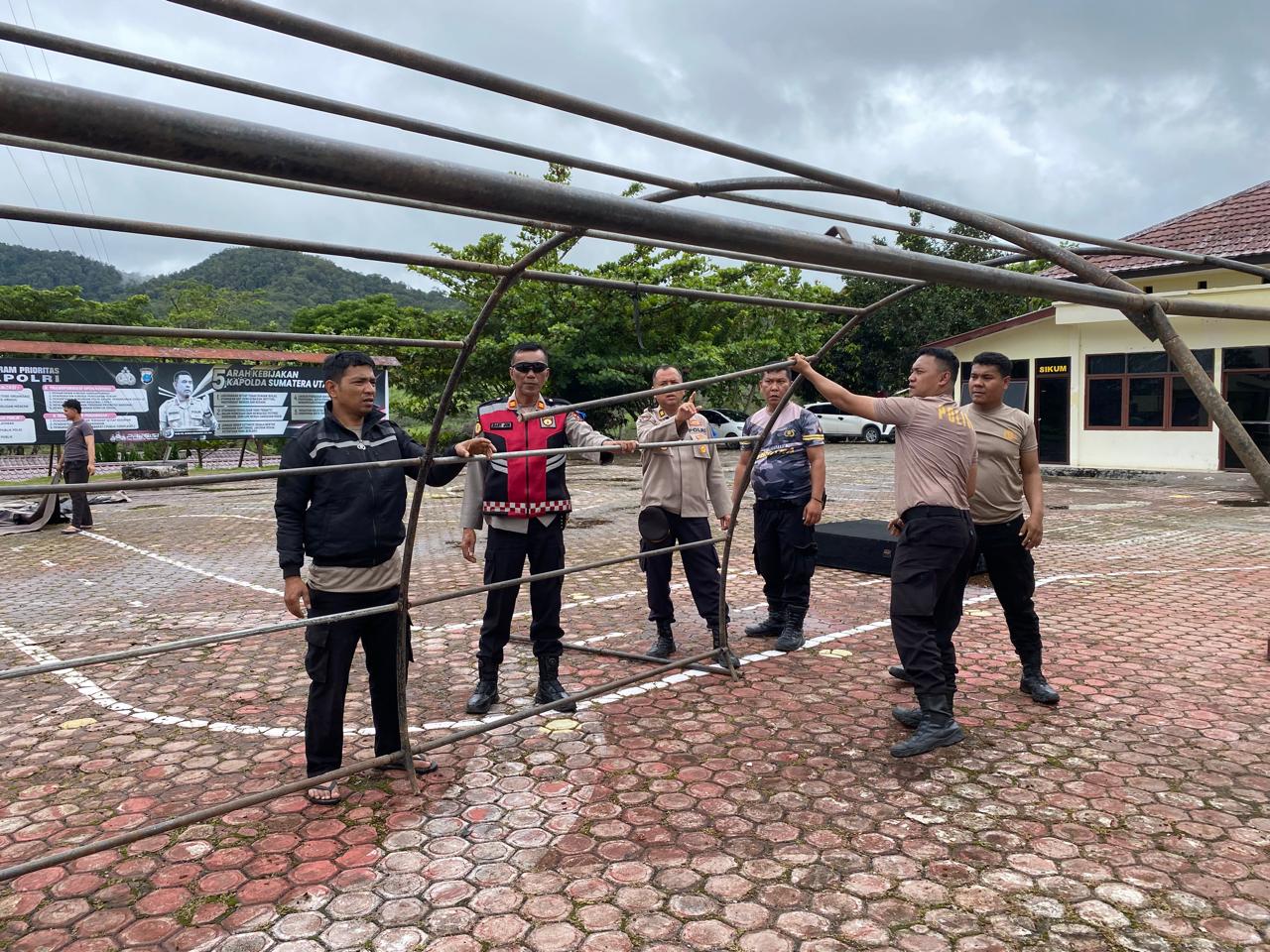 Selanjutnya Personil Sat Samapta mengeluarkan peralatan dari Gudang Bag Log berupa Tenda lapangan dan langsung memasangnya/mendirikannya di lapangan Apel Mapolres Pakpak Bharat.