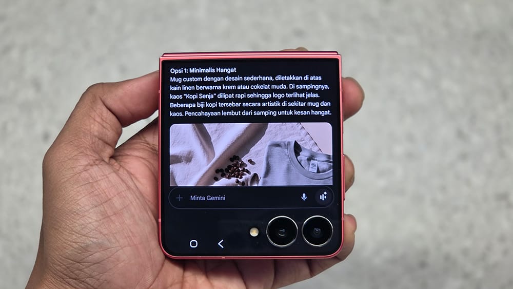Misalnya, kamu baru saja selesai memproduksi kaos bertema ‘Kopi Senja’ dan butuh foto produk yang menarik untuk diunggah ke e-commerce. Kamu bisa langsung aktifkan Gemini Live Cover Screen di Z Flip7 dan beri perintah, “Beri tiga konsep foto etalase untuk kaos ‘Kopi Senja’ dengan gaya flat-lay estetik, sertakan properti seperti biji kopi dan cangkir keramik.”