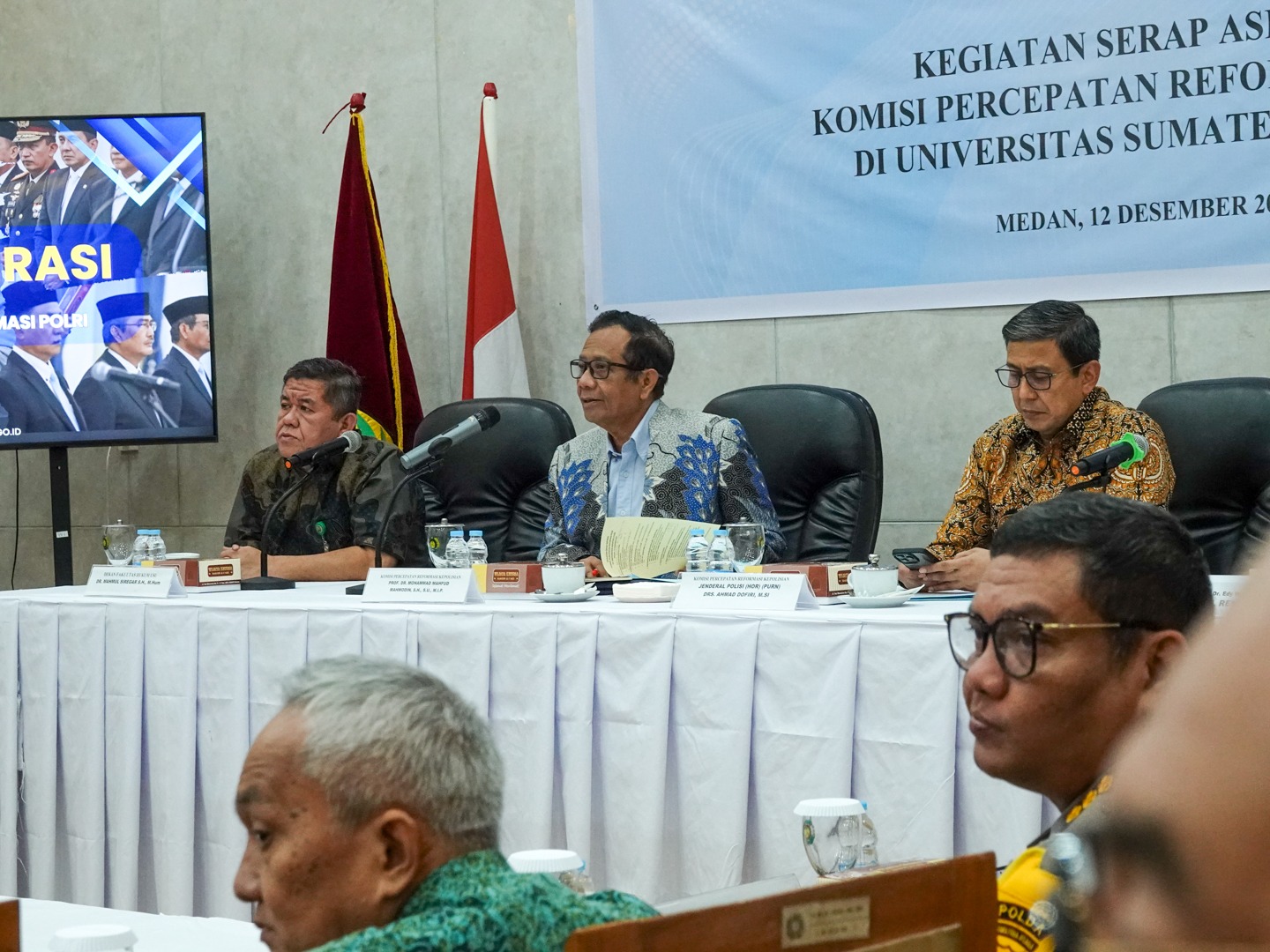 Aspirasi tersebut dihimpun Anggota Komisi Mahfud MD dan Ahmad Dofri dalam public hearing di Ruang Dewan Pertimbangan Fakultas Hukum Universitas Sumatera Utara (USU), Jumat (12/12/2025). “Kami banyak mendapat hal baru dan penguatan. Semua berharap polisi menjadi lebih baik. Dari 467.000 personel, yang bermasalah hanya oknum, karena masih ada sekitar 90% personel yang melayani masyarakat dengan baik,” ujar Mahfud.