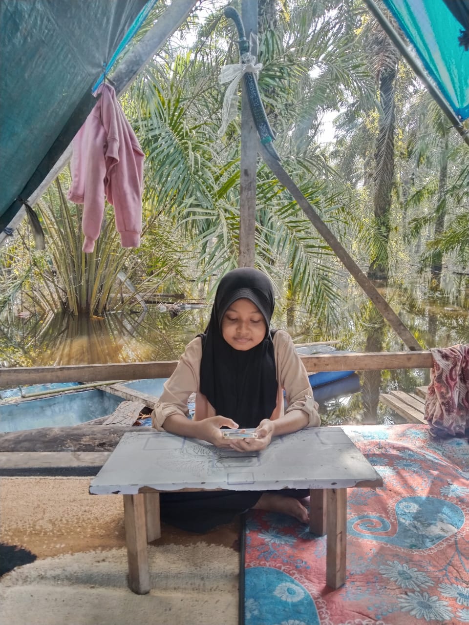 Syafa tetap berusaha menjaga konsentrasi meski suasana sekitar tidak senyaman belajar di rumah. Semangatnya menjadi potret keteguhan siswa di tengah keterbatasan.