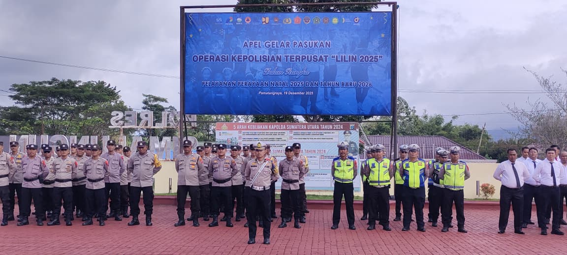 sentralberita|Medan~ Polres Simalungun menggelar Apel Gelar Pasukan Operasi Kepolisian Terpusat “Lilin Toba 2025” dalam rangka pengamanan Hari Raya Natal 2025 dan Tahun Baru 2026, Jumat (19/12/2025) pukul 10.00 WIB di Lapangan Apel Mako Polres Simalungun, Jalan Jon Horailam Saragih No.110, Pematang Raya.
