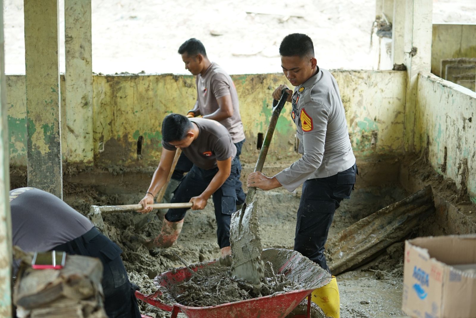 Tidak berhenti di rumah ibadah, personel Brimob bersama para taruna juga menyasar rumah-rumah warga yang terdampak banjir. Dengan peralatan seadanya, mereka membersihkan lantai rumah, halaman, serta saluran air, membantu meringankan beban warga yang masih berjuang memulihkan kehidupan pascabanjir.