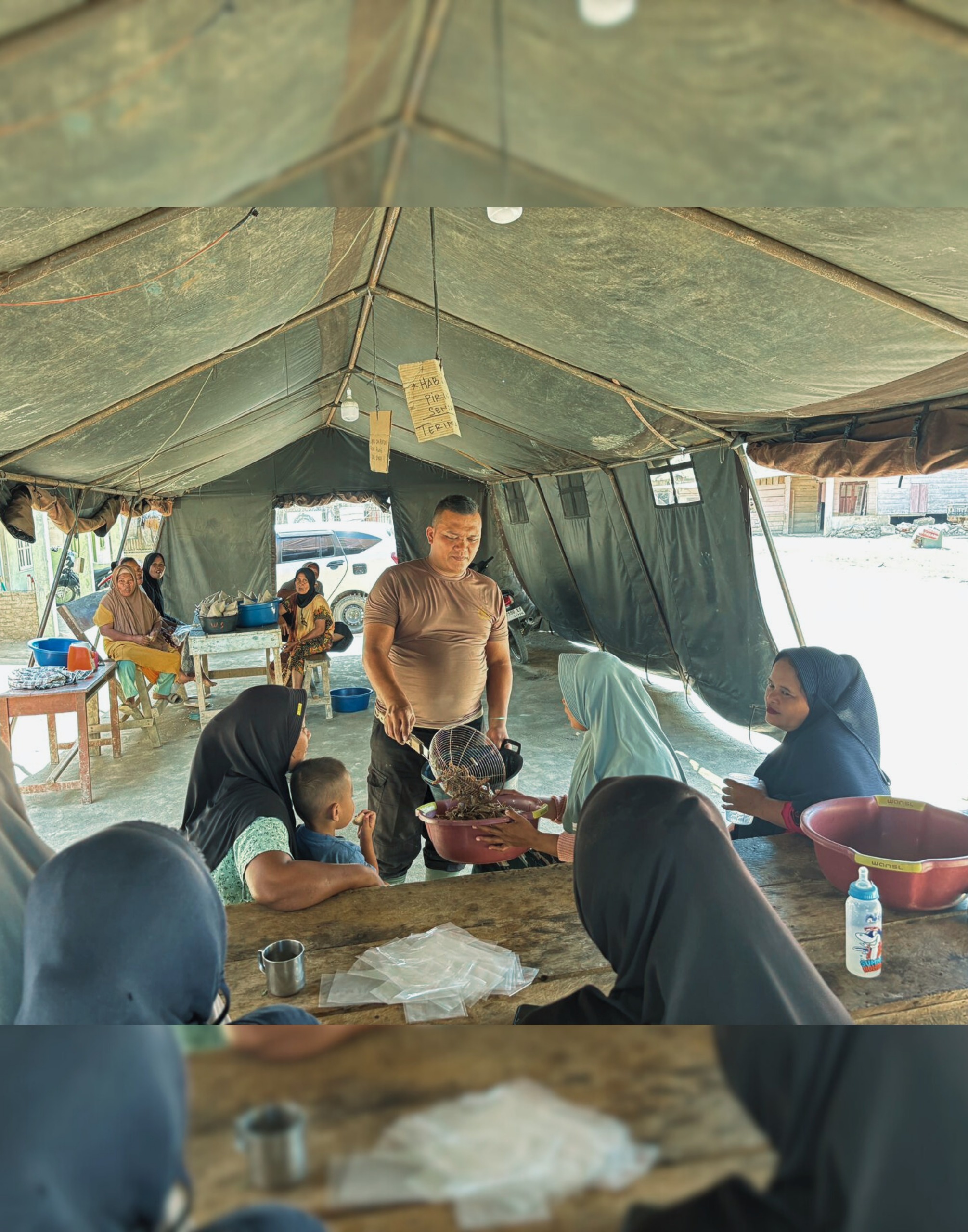 Pada kegiatan tersebut, personel Brimob melaksanakan pengoperasian dapur lapangan guna mendukung kebutuhan logistik personel dan warga sekitar, sekaligus melanjutkan pembersihan rumah warga yang terdampak, yakni rumah Ibu Nurimah dan rumah Bapak Halomoan Manalu. Kegiatan ini dilakukan sebagai bagian dari upaya berkelanjutan untuk membantu warga memulihkan kondisi lingkungan tempat tinggal mereka.