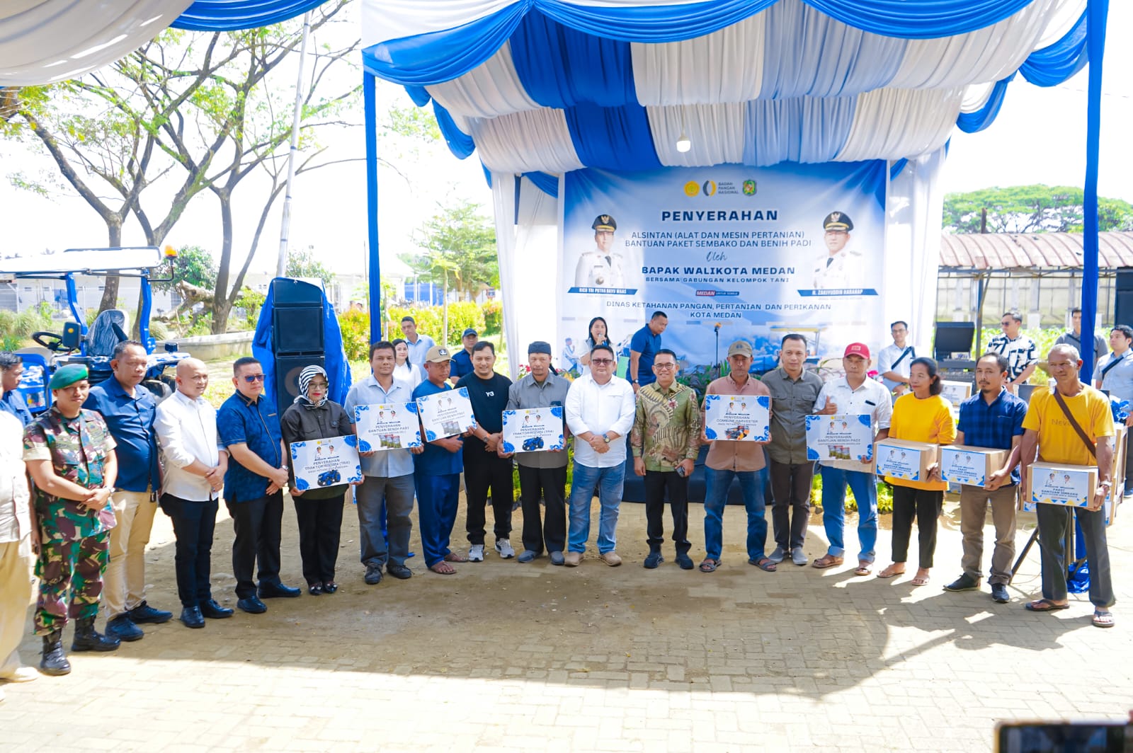 sentralberita|Medan~Senyum sumringah terpancar dari wajah para petani di Kota Medan. Harapan mereka untuk meningkatkan produktivitas pertanian kini mulai dapat diwujudkan dengan adanya suntikan semangat baru melalui bantuan alat mesin pertanian (ALSINTAN) berupa 2 unit Traktor Roda 4, dan 1 unit Combine Harvester ditambah bantuan benih padi, dan bantuan paket sembako.
