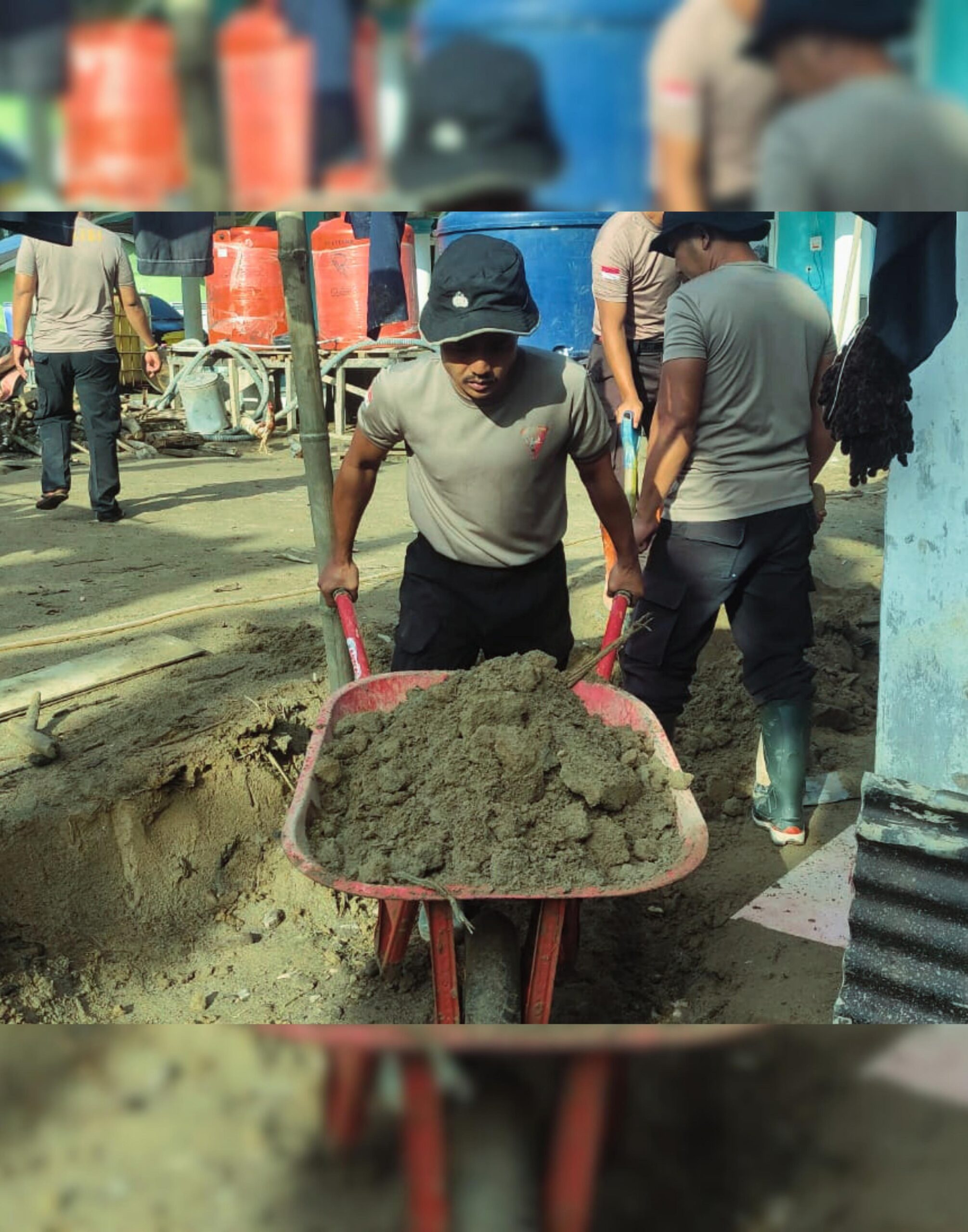 Selain itu, personel Brimob turut membantu warga dalam penyambungan dan penanaman pipa air menuju rumah-rumah warga guna memastikan ketersediaan akses air bersih. Upaya tersebut dilakukan secara gotong royong bersama masyarakat setempat sebagai langkah konkret mendukung pemulihan kehidupan sehari-hari warga pascabencana.