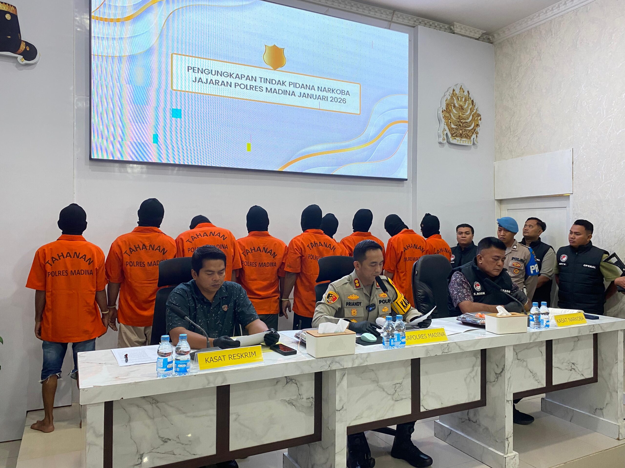 “Dari 18 tersangka, 9 di antaranya ditangani oleh Polres Madina. “Dari 9 tersangka yang ditangani Polres Madina, 5 orang sudah dititipkan di Lapas, sedangkan 4 lainnya sudah dititipkan di Rehabilitasi Amelia Padang Sidempuan,” ujar Kapolres Mandailing Natal ( Madina) AKBP Bagus Priandy dalam konferensi pers, Jum’at (13/2/2026)