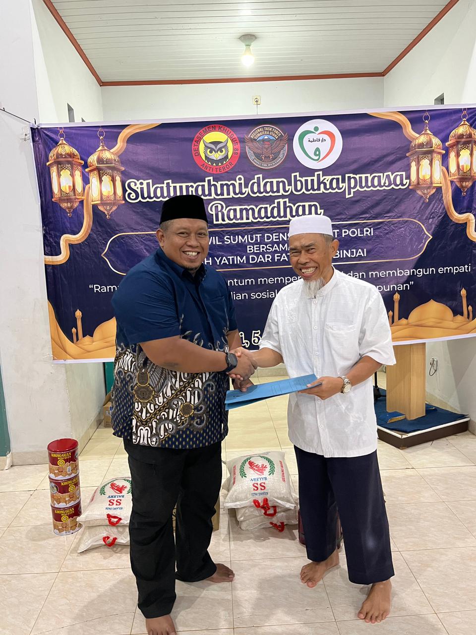 Mengusung tema “Ramadhan sebagai Momentum Memperbaiki Diri dan Membangun Empati Melalui Kepedulian Sosial di Bulan Penuh Ampunan”, Satgaswil Sumut Densus 88 AT Polri juga menyerahkan bantuan sosial kepada Rumah Yatim Dar Fathimah berupa paket sembako. Selain itu, sebagai bentuk perhatian dan kasih sayang kepada anak-anak yatim, turut diberikan bingkisan berupa mukena, sarung, serta santunan.