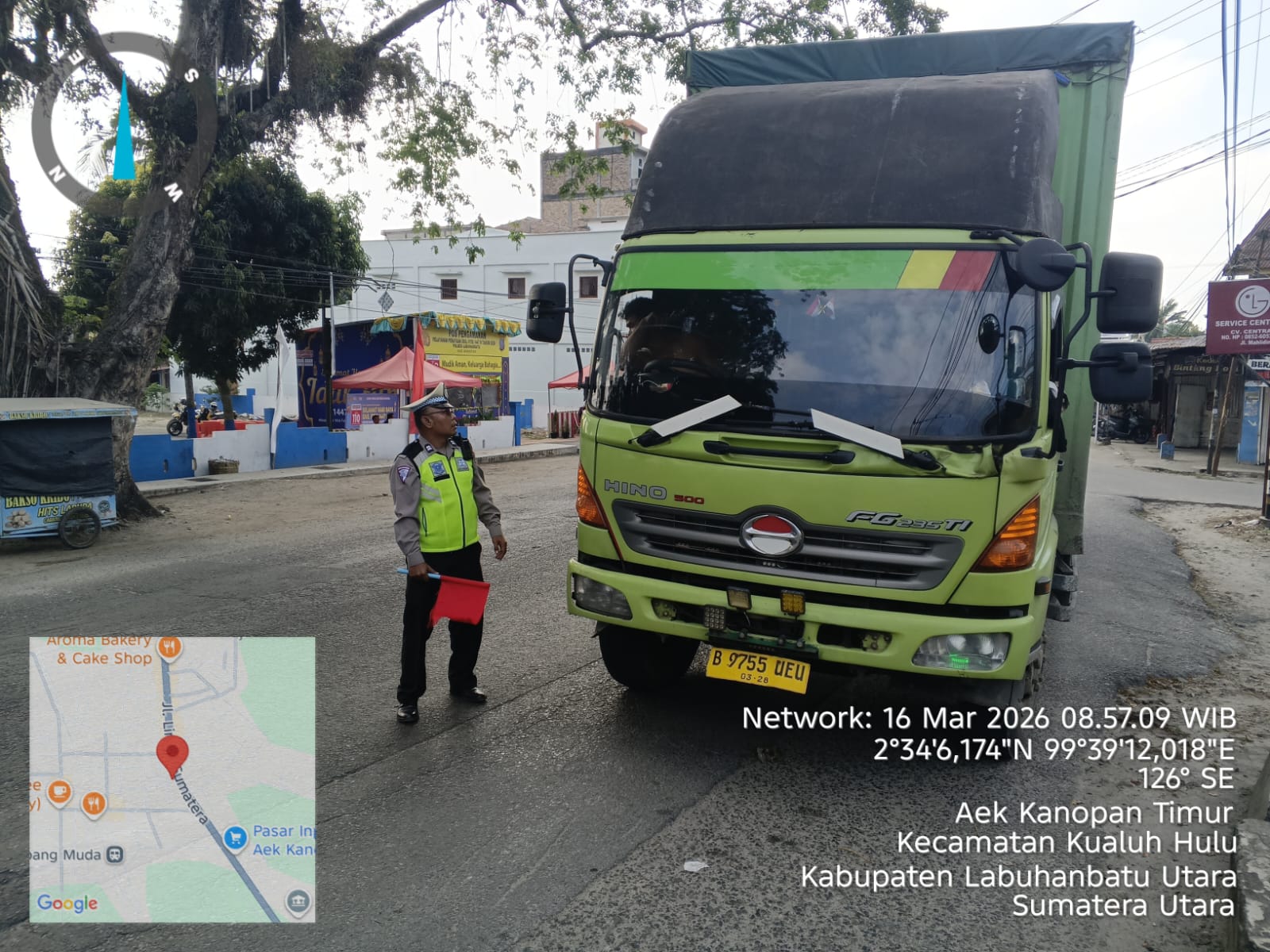 sentralberita | Labuhanbatu ~ Personel Pos Pengamanan (Pospam) 2 Aek Kanopan Polres Labuhanbatu melakukan sosialisasi dan imbauan kepada pengemudi kendaraan angkutan barang sumbu tiga keatas agar tidak beroperasi sementara, selama pelaksanaan Operasi Ketupat 2026 di wilayah Aek Kanopan, Kabupaten Labuhanbatu Utara, Senin (16/3/2026).