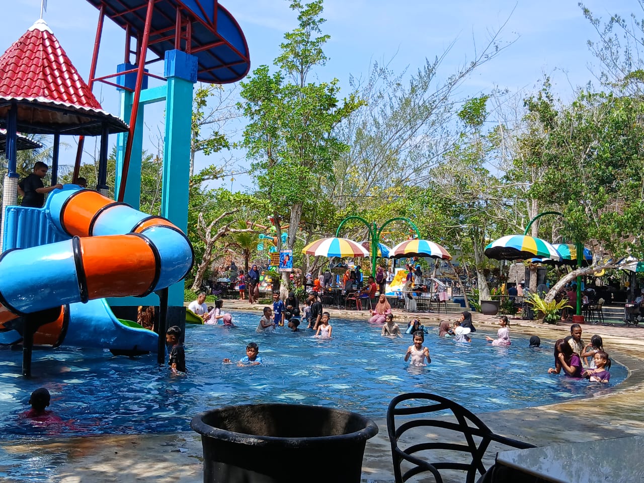 Tak hanya orang dewasa, anak-anak dengan riang gembira berenang, bermain air, dan mencoba berbagai wahana seluncuran berwarna-warni yang tersedia. Gelak tawa pun terdengar riuh, menambah kemeriahan suasana liburan.
