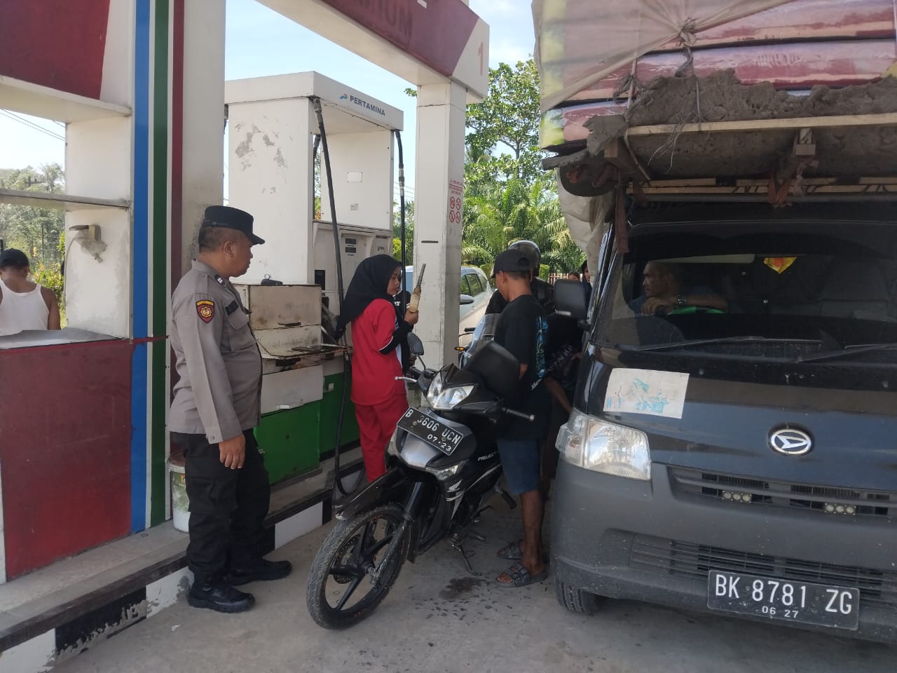 Pada Selasa (7/4) siang, dua personel Polsek Datuk Bandar melakukan patroli intensif di SPBU Pertamina Batu 7, Jalan Sudirman, Kelurahan Sijambi.