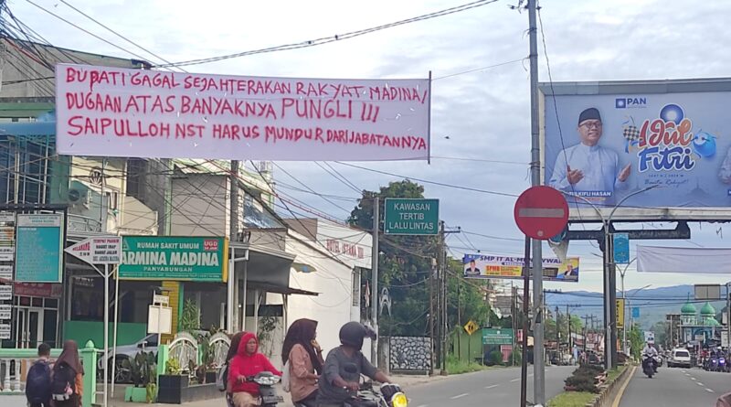 Viewssentralberita | Panyabungan ~ Dua buah spanduk tak diketahui identitasnya berisi desakan agar Bupati Mandailing Natal, Saipullah Nasution, mundur dari